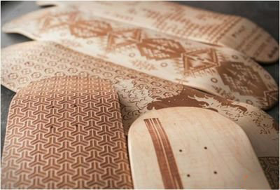 激光雕刻滑板是使木板表面受到強大的激光熱能而溫度急劇增加,使該點因高溫而迅速的融化或者汽化,配合激光頭的運行軌跡從而做出想要的圖形文字。激光雕刻速度快,精度高、無論何種形狀何種圖案都可以精準快速成型。