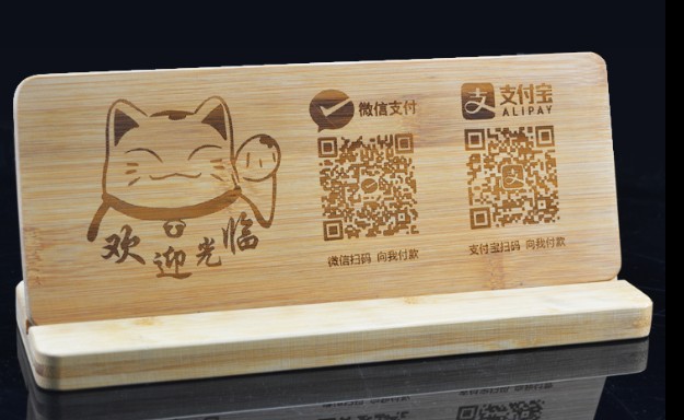 激光雕刻機是無接觸加工,不會對竹木材料造成損壞擠壓;雕刻精度高、速度快,雕刻出的圖面光滑平整;識別度高。激光雕刻的收錢碼獨特新穎,可提升店面形象,給顧客留下深刻印象,起到一定的宣傳作用。