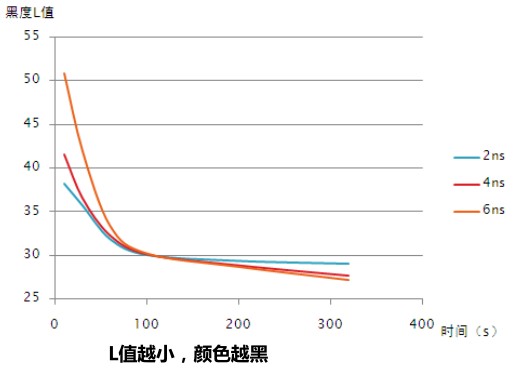 氧化鋁打黑(@F=220)不同脈寬對應效果與時間關系如下 :