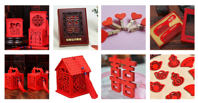 木制婚慶用品因其古樸厚重的質(zhì)感,經(jīng)常被應(yīng)用于各類婚慶用品的外包裝,例如:喜糖盒、紅酒盒、裝飾掛件、擺件、木制喜字等。婚慶木制品往往做工精細(xì)、用料考究、擁有精美的外觀及造型,因此木制婚慶品其本身也通常具有極強(qiáng)的觀賞性和商品性。由于選材、做工以及配件的考究,也使得婚慶用品的價格高于其他材質(zhì)。